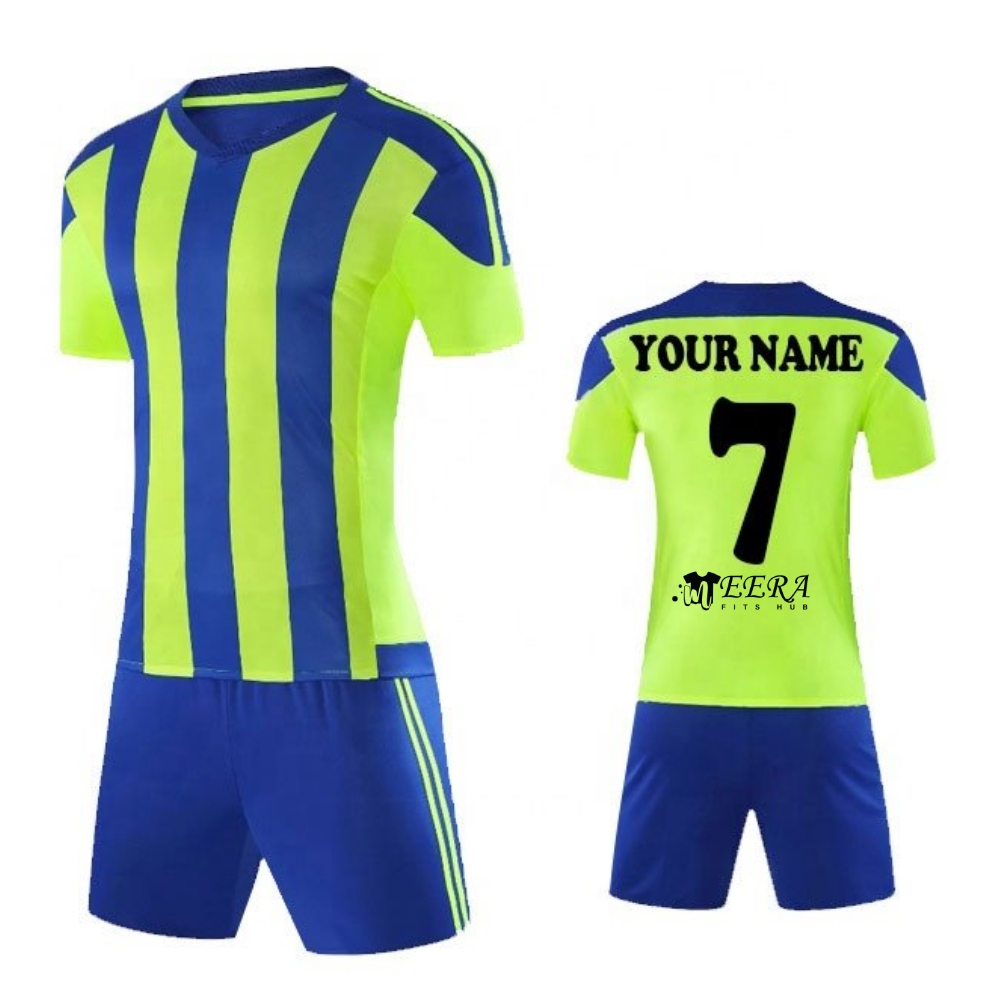 Choose Meera Fits Hub’s Neon Green & Blue soccer uniforms to give your team a standout presence on the field with a uniform that combines vibrant colors, high performance, and lasting quality.